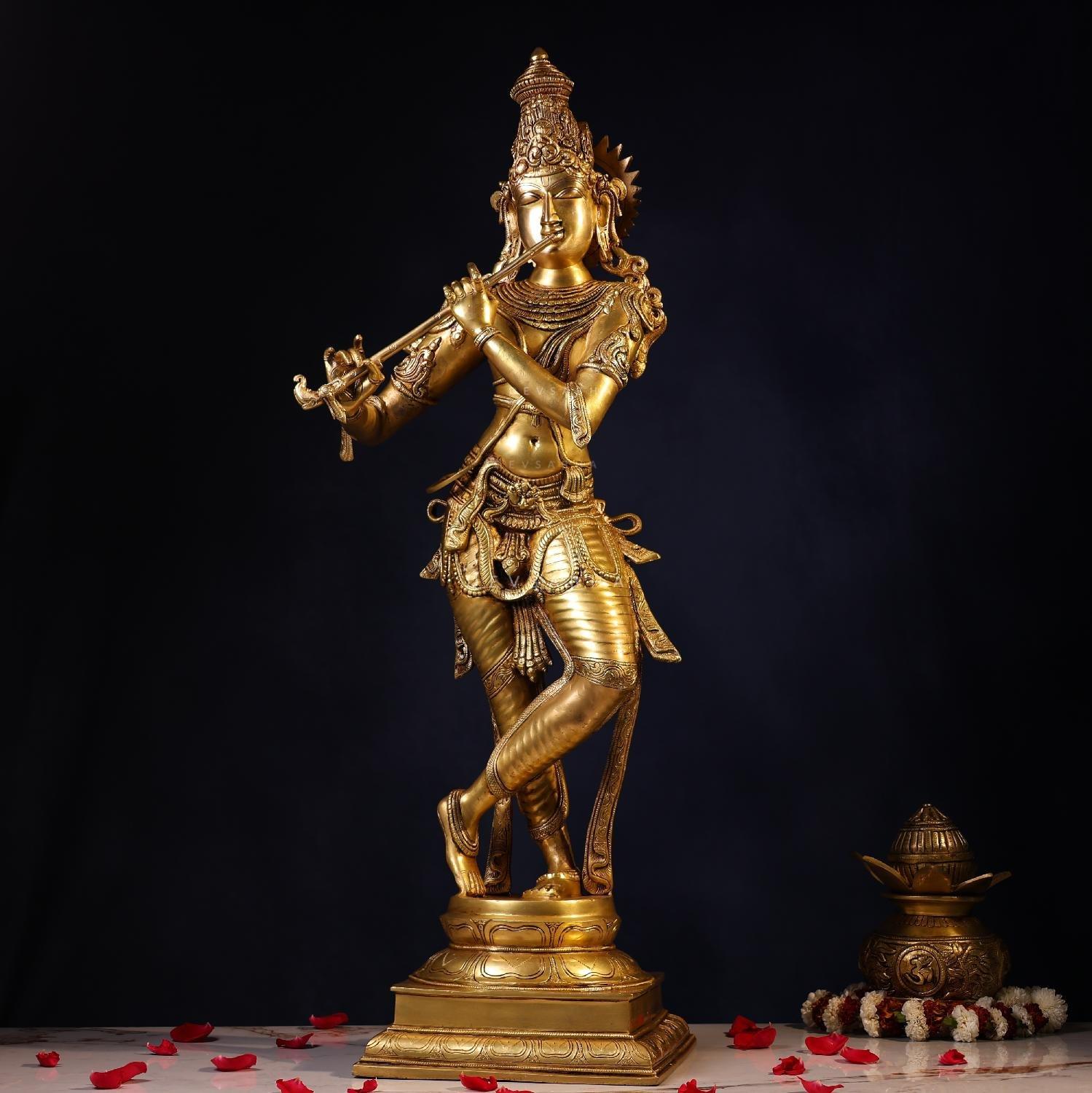 DevSabha presents a beautiful 25-inch antique Krishna idol crafted from high-quality brass This idol captures the divine charm of Lord Krishna with intricate detailing and a rich antique finish A perfect choice for home decor and puja this idol brings blessings and peace Ideal for temples and spiritual spaces it reflects devotion and fine artistry A valuable gift for loved ones this Krishna idol adds a sacred touch to any place Explore more divine collections at DevSabha and bring home the grace of Lord Krishna Today