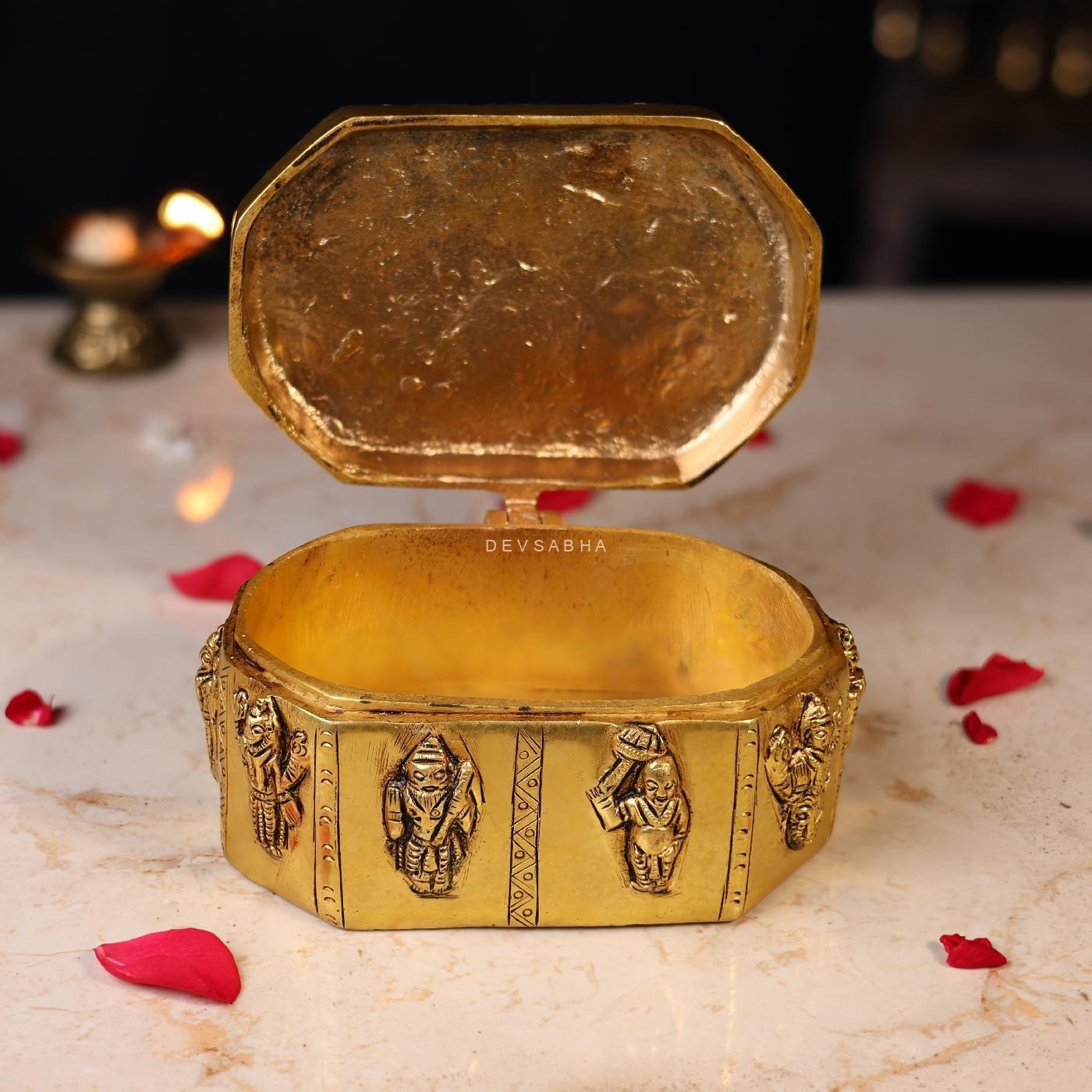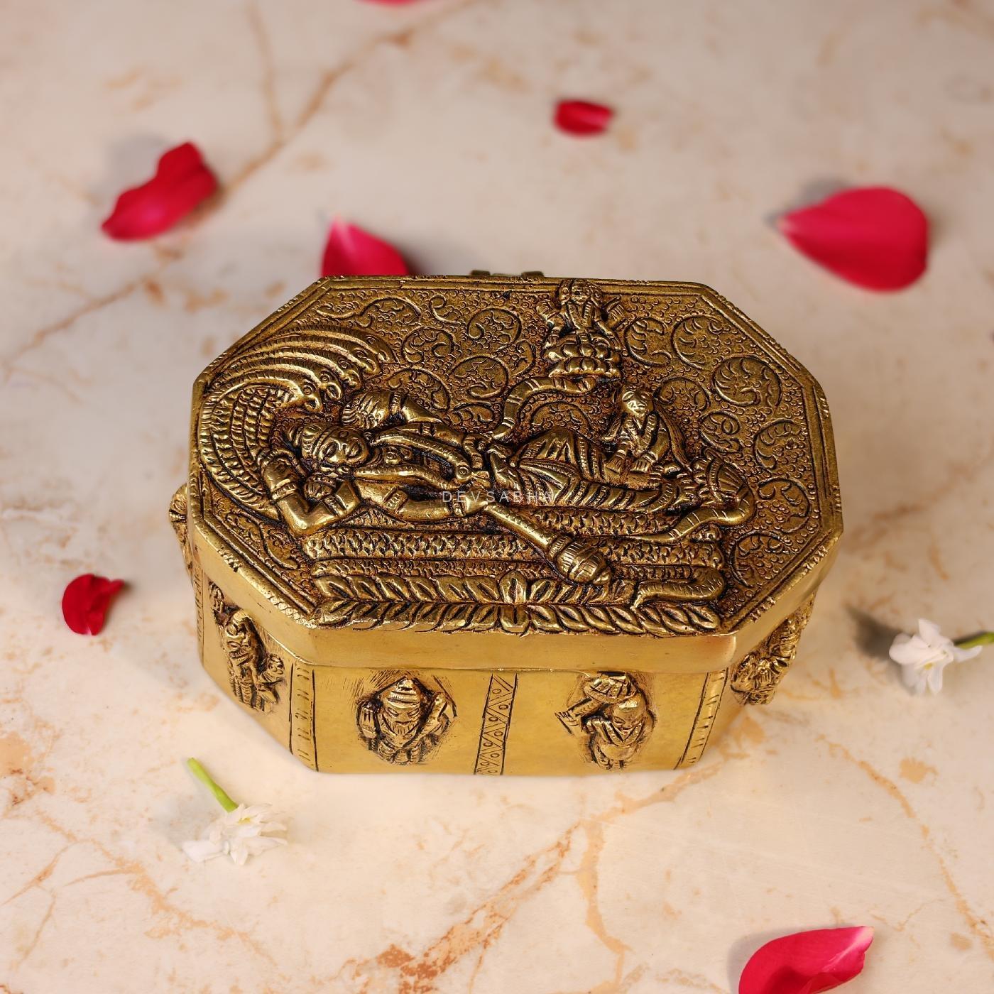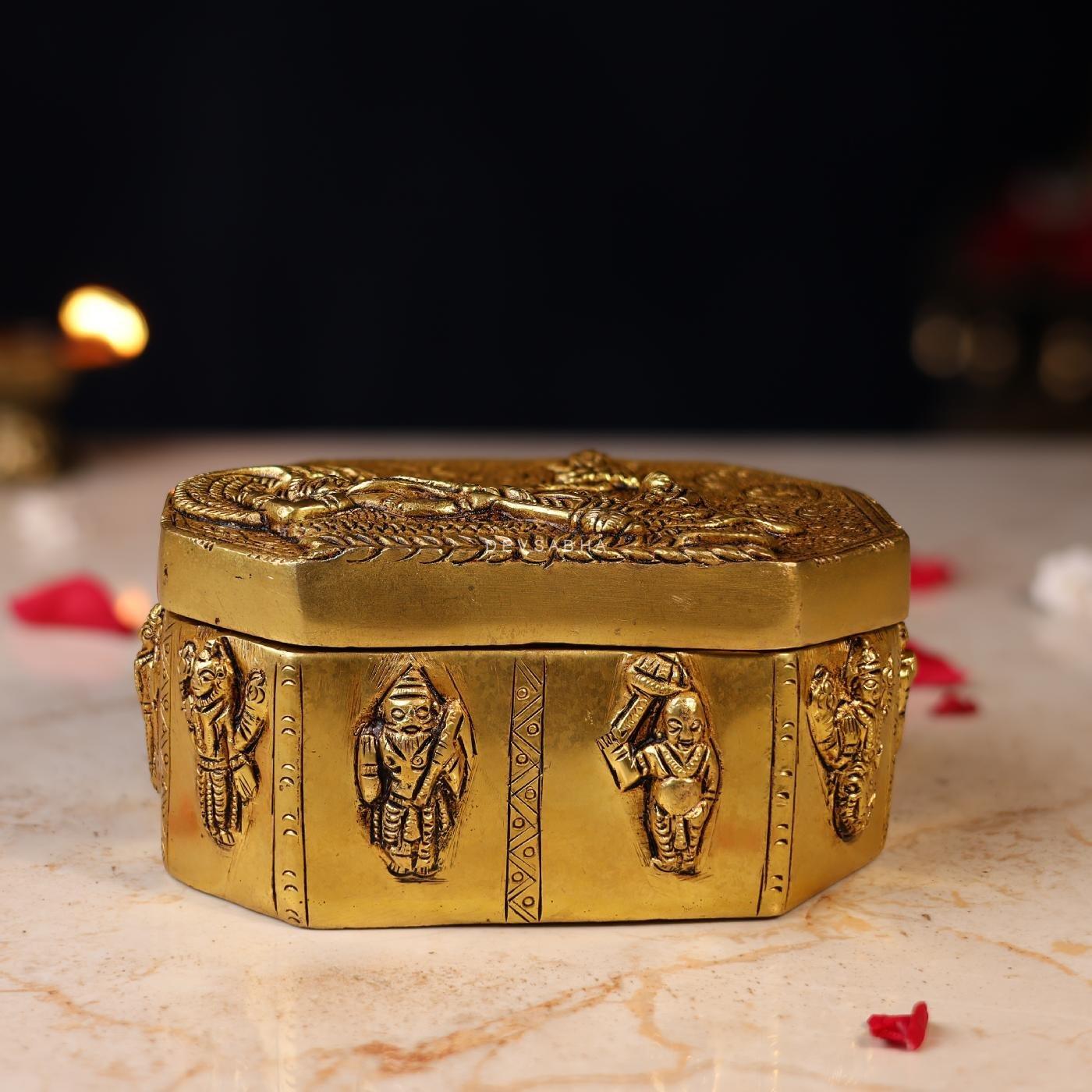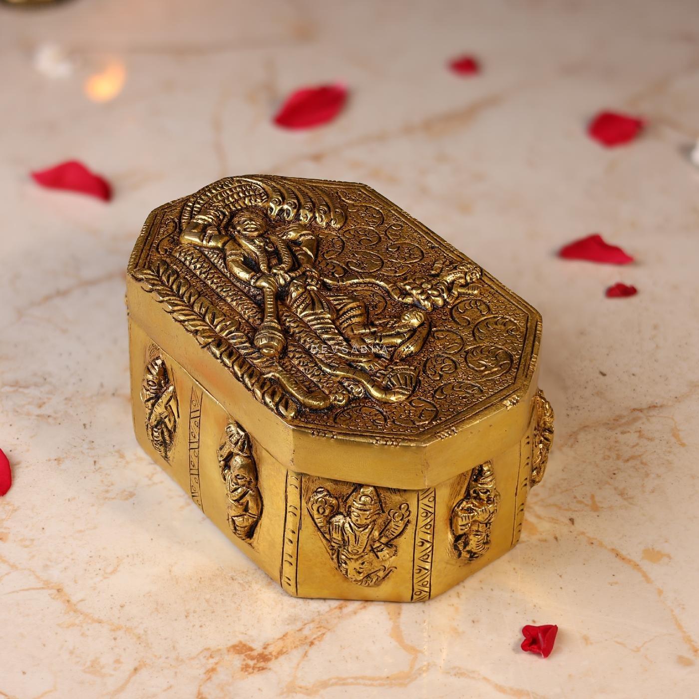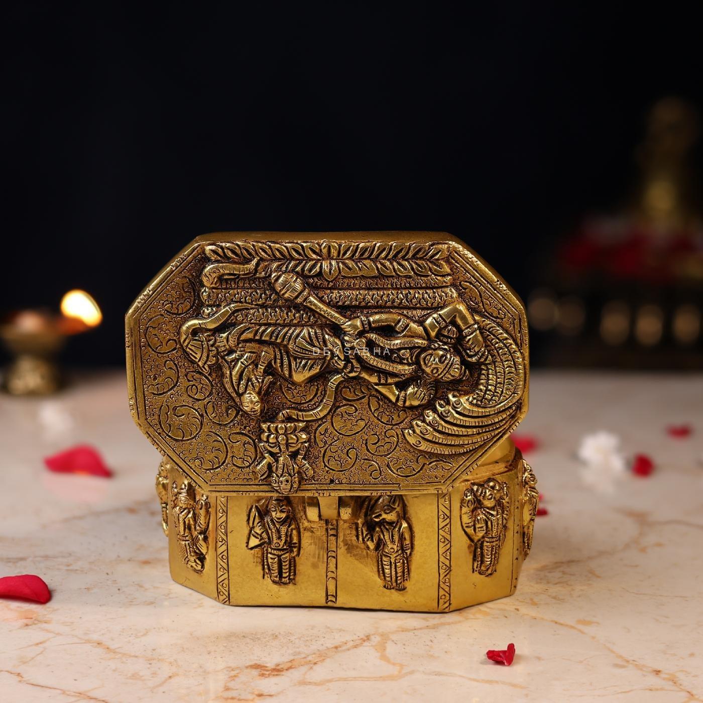This Brass Dashavatar Box with Vishnu (3 inches) is handcrafted from pure brass with detailed artistry. Featuring Lord Vishnu and his ten avatars, it symbolizes divine protection, harmony, and balance. Compact and elegant, it is perfect for daily pooja, travel-friendly worship, or gifting.