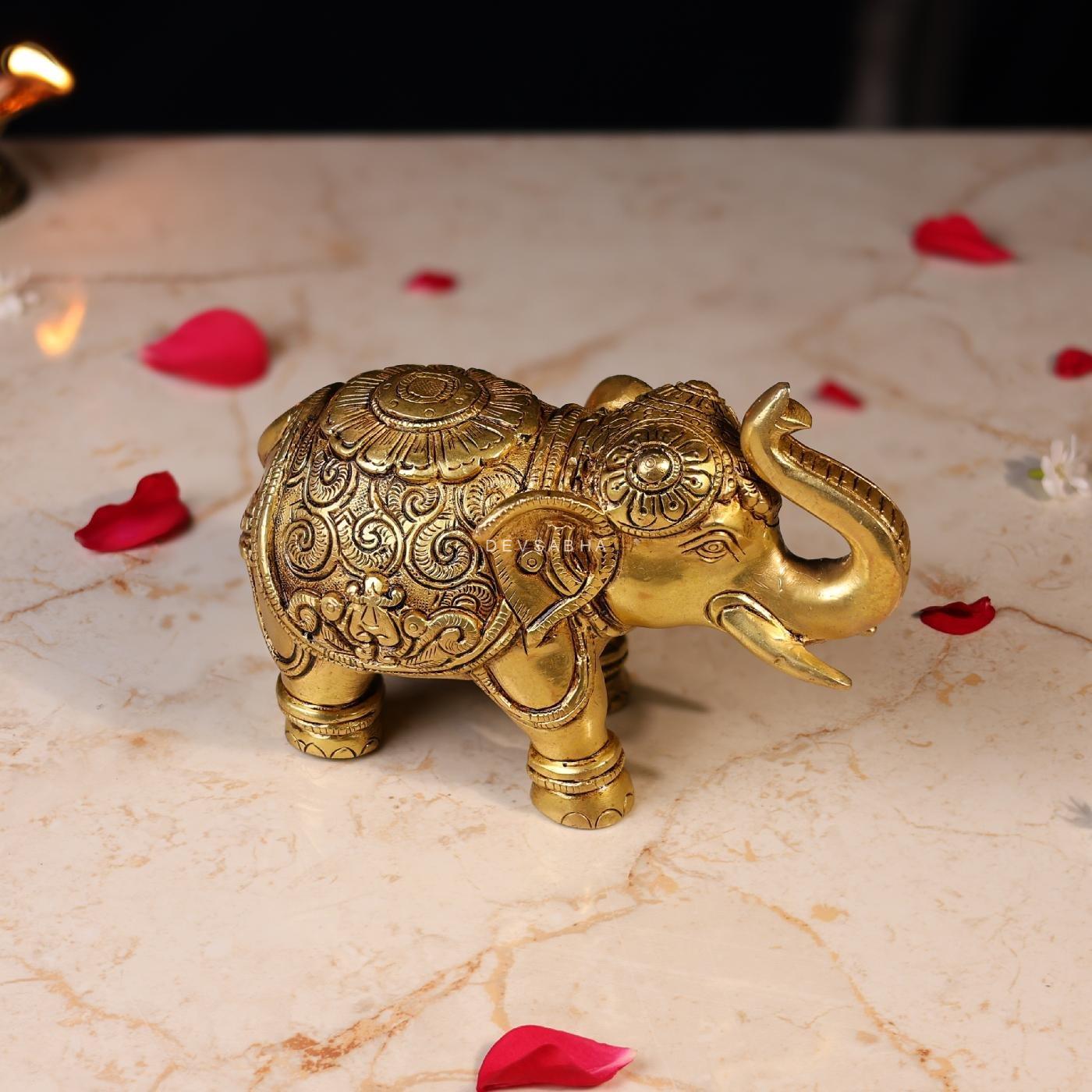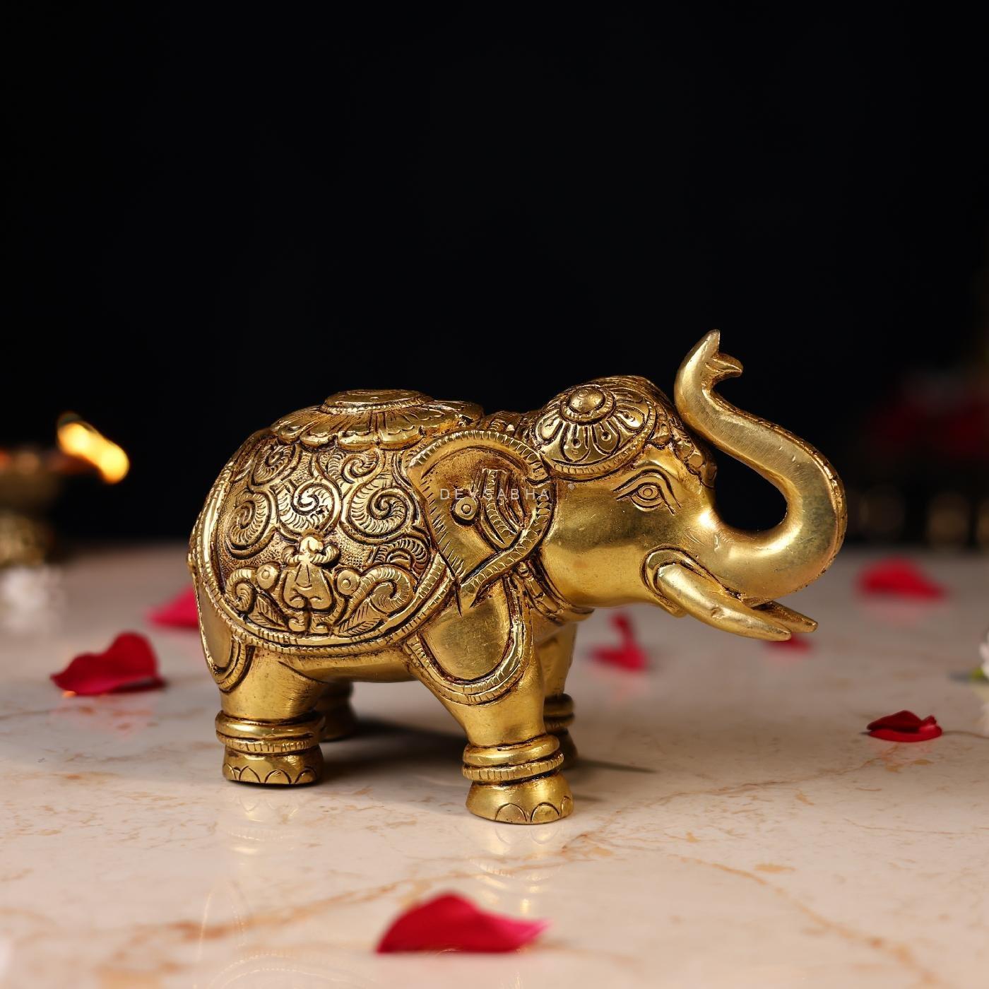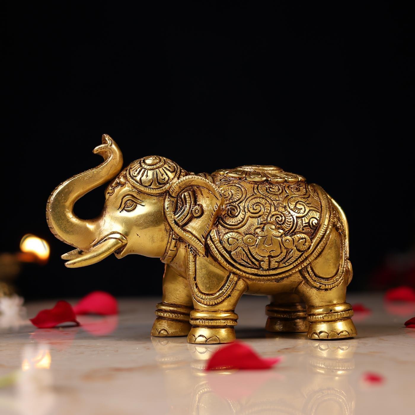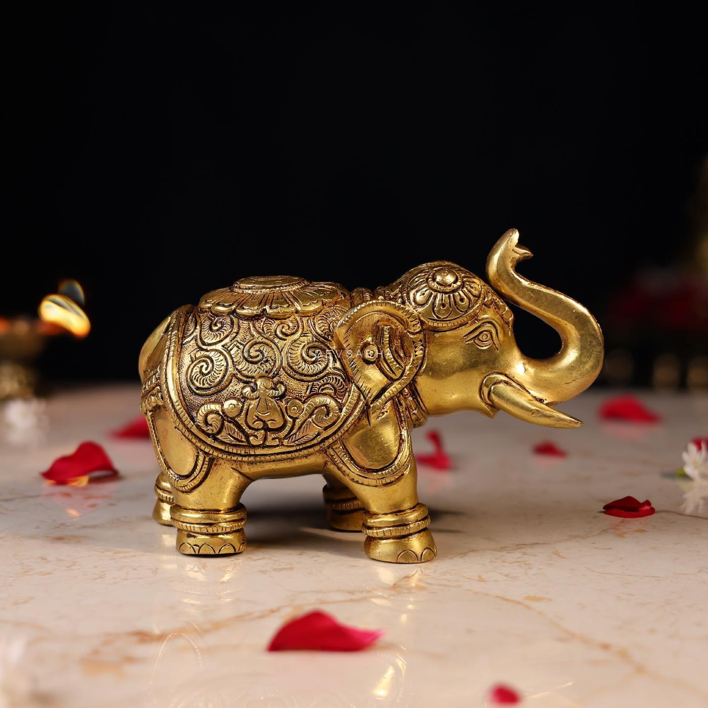 This Brass Elephant Statue with Carving (4.5 inches) is handcrafted from pure brass with intricate detailing. A symbol of strength, wisdom, and prosperity, it is perfect for home décor, office décor, or gifting. Compact and durable, it adds a touch of tradition and elegance to any space.