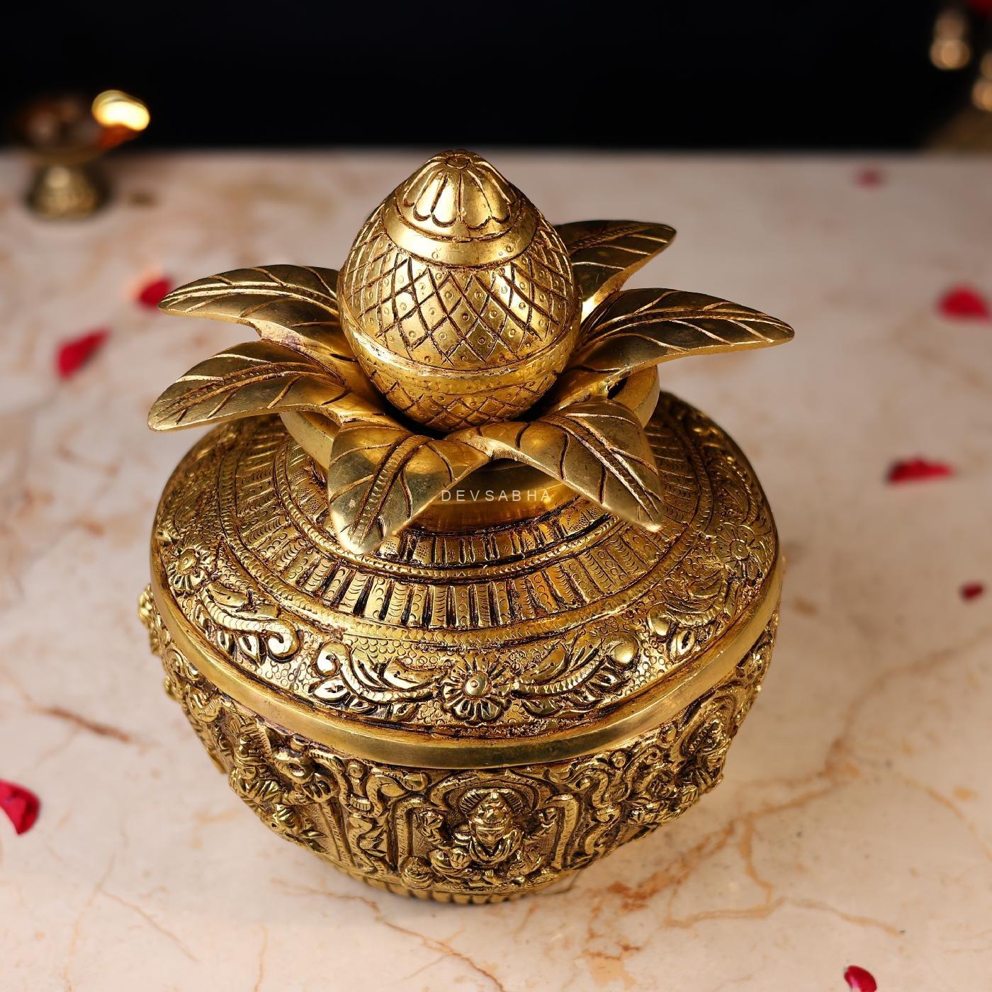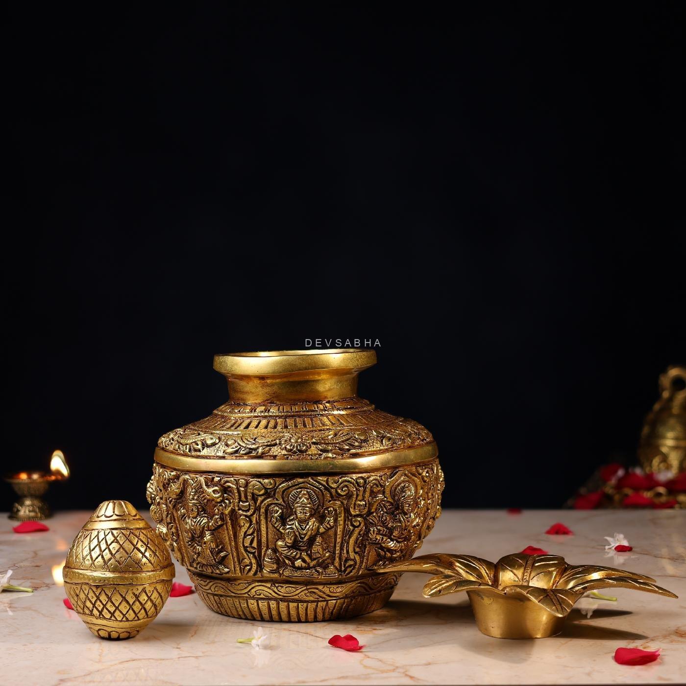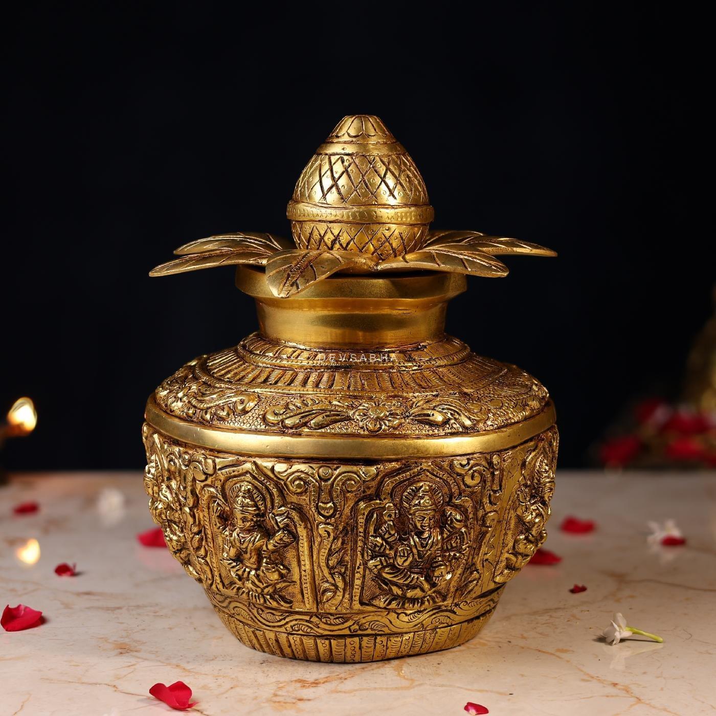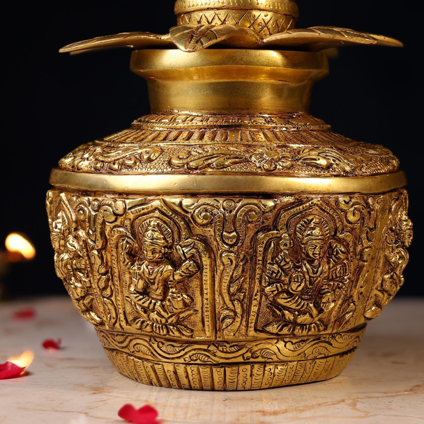 This Brass Kalash with Ashta Laxmi Carving (10 inches) is handcrafted from pure brass with intricate detailing. Featuring the eight forms of Goddess Laxmi, it represents wealth, prosperity, and auspiciousness. Perfect for daily pooja, temple rituals, weddings, or gifting, it adds sacred elegance to any spiritual setup.