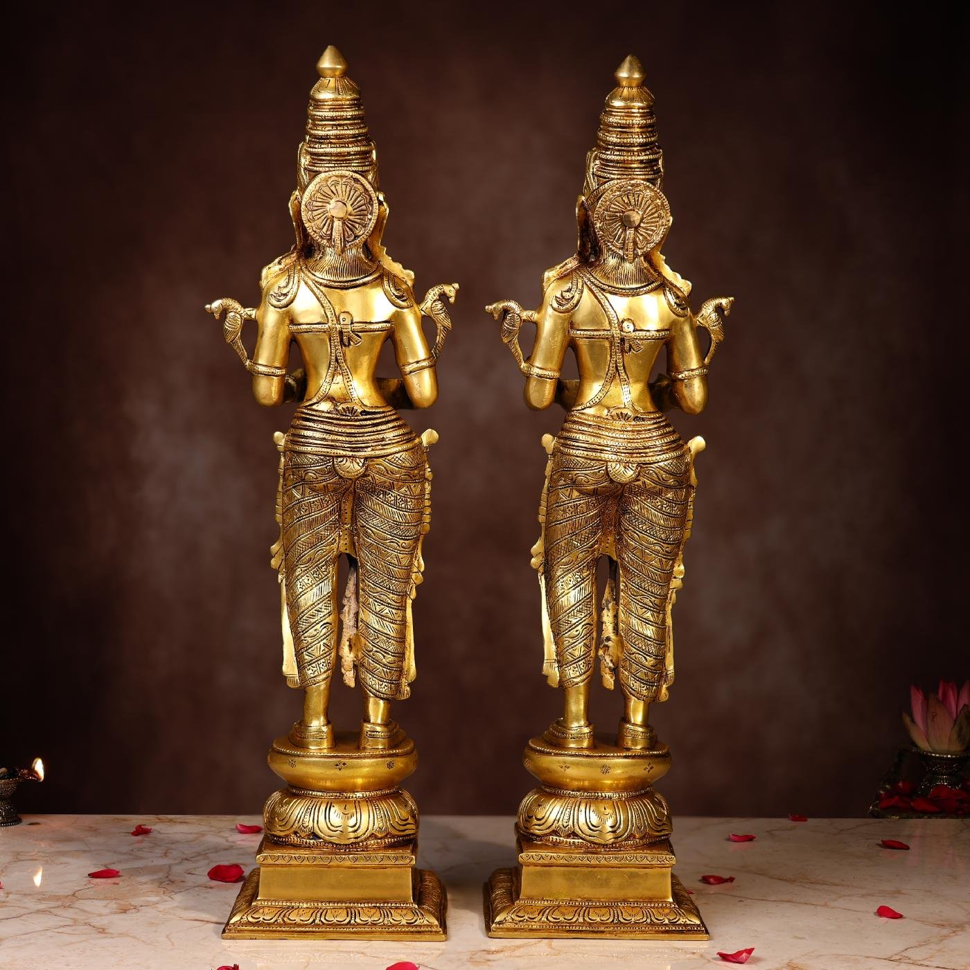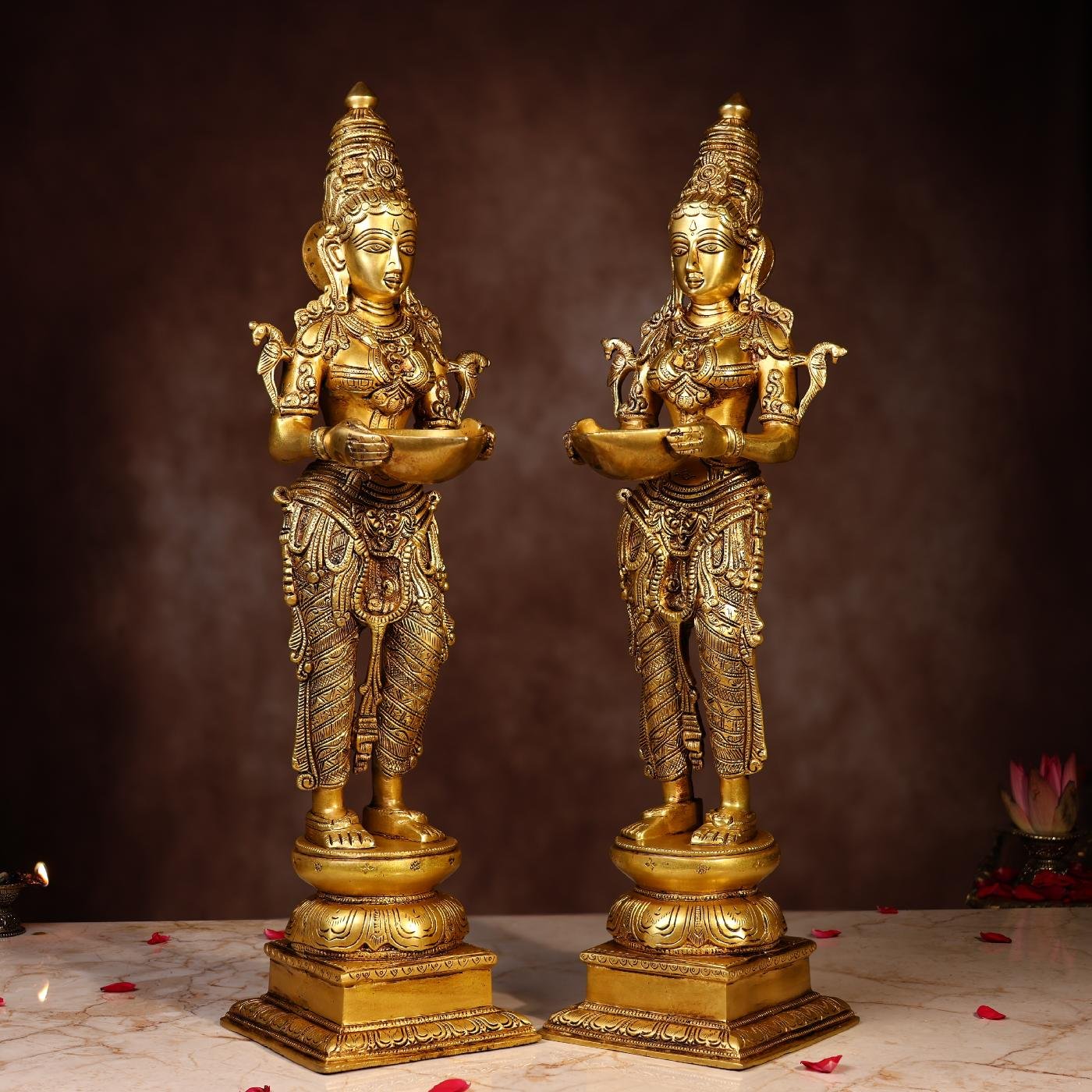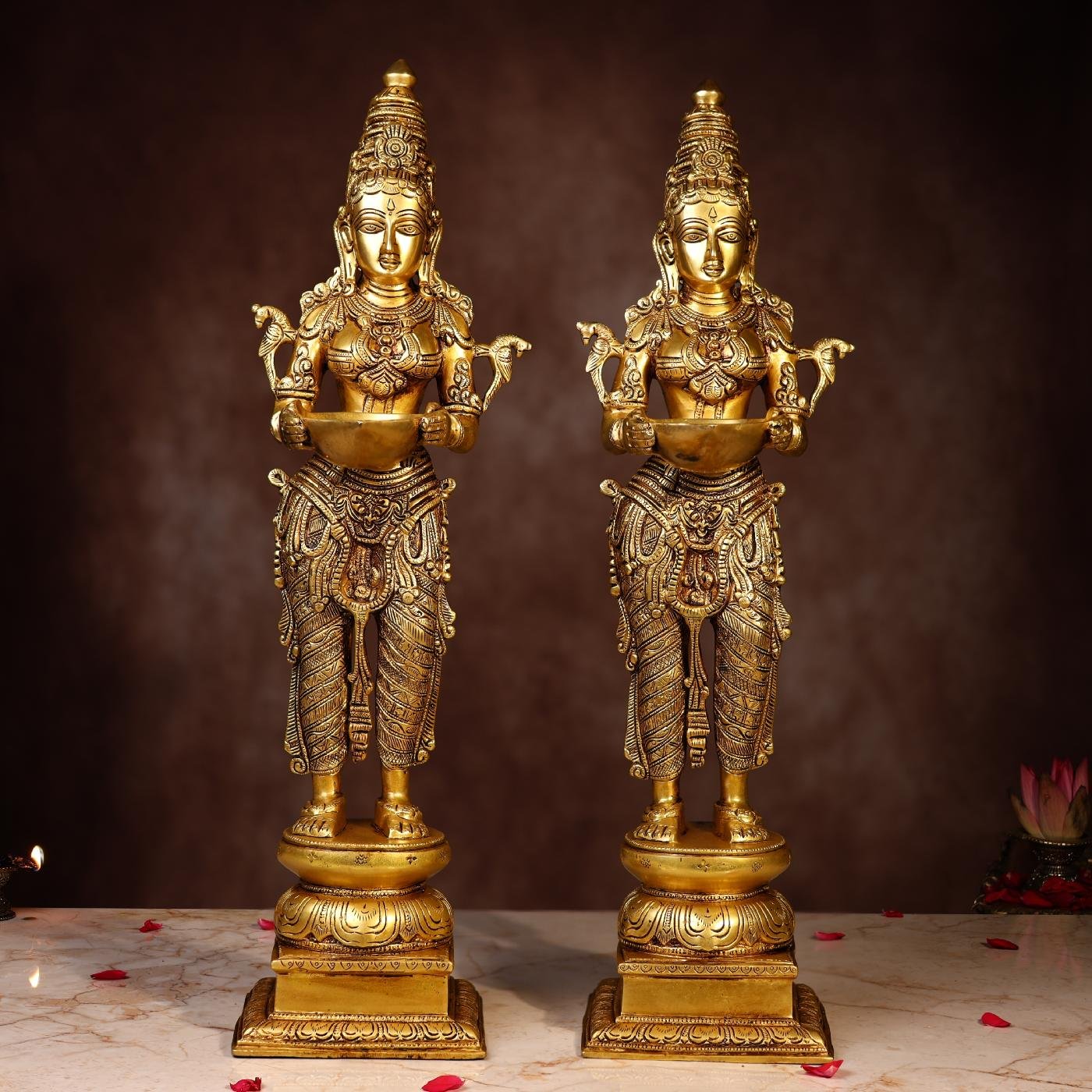 This Brass Lady Lamp Pair (23.5 inches each) is handcrafted from pure brass with elegant traditional detailing. Featuring graceful lady figures holding lamps, this pair is perfect for home décor, festivals, weddings, or gifting. Tall and artistic, they add luxury, culture, and charm to any space.