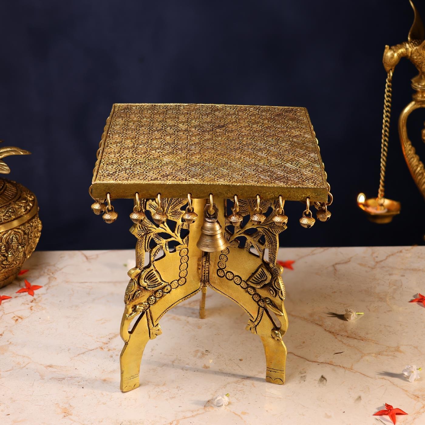 This Brass Stool (11.5 inches) is handcrafted from pure brass with elegant detailing. Traditionally used as a chowki for idols, kalash, or pooja items, it also serves as a decorative piece for homes and temples. Strong and graceful, it adds both utility and charm to your sacred space