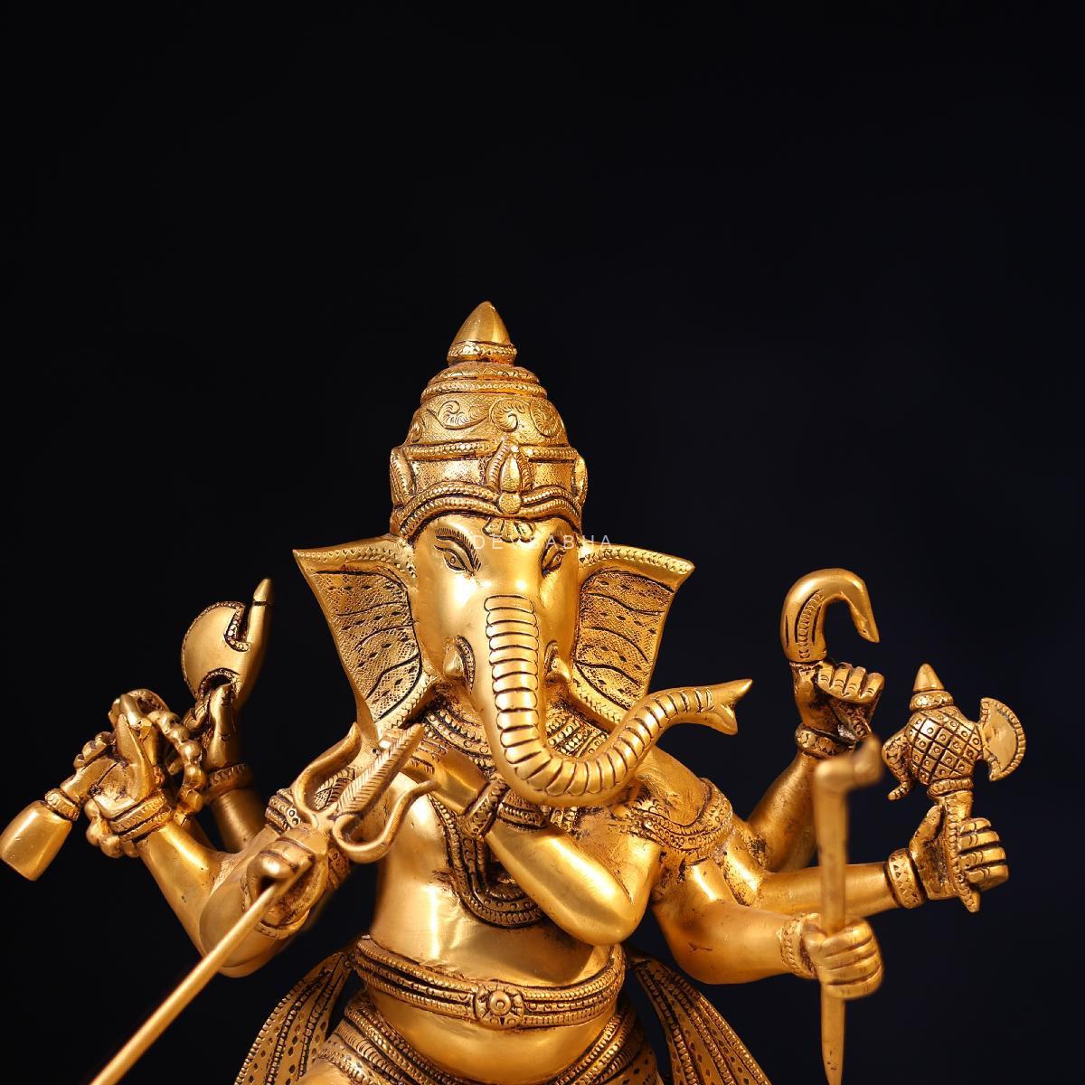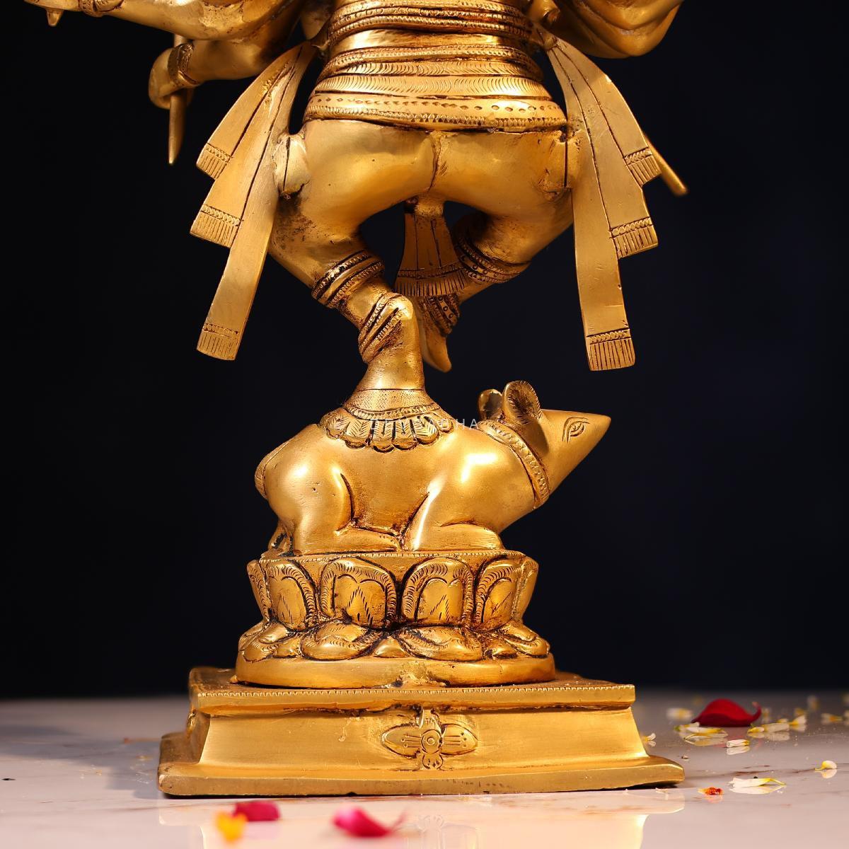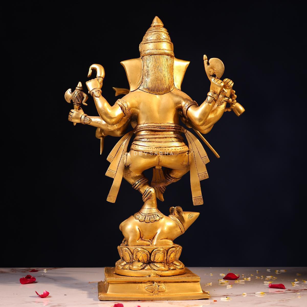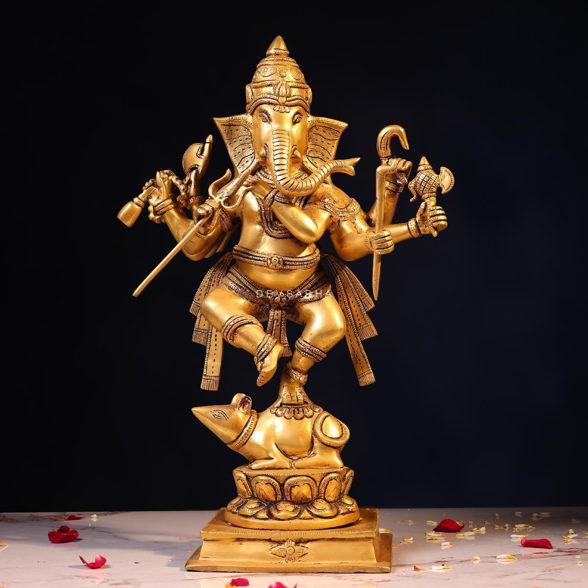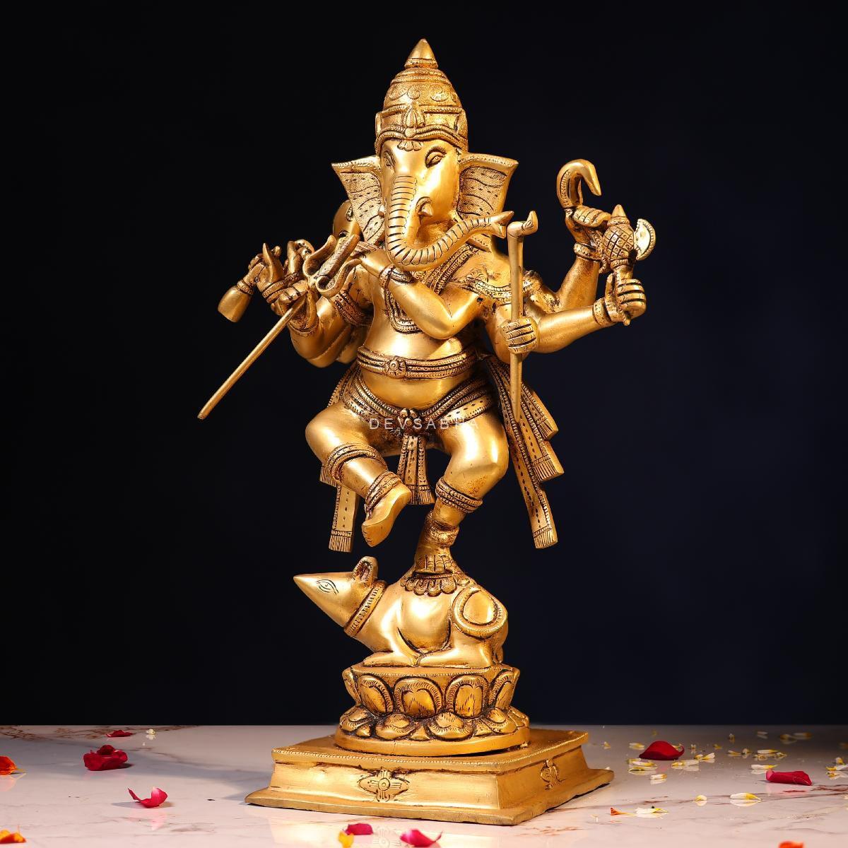 Bring joy, prosperity, and positive energy into your space with this beautifully handcrafted Brass Lord Ganesh Dancing on Mushak Idol. Standing at 18.5 inches, this lively form of Lord Ganesh symbolizes happiness, success, and the removal of obstacles, making it ideal for pooja rooms, temples, and spiritual décor.