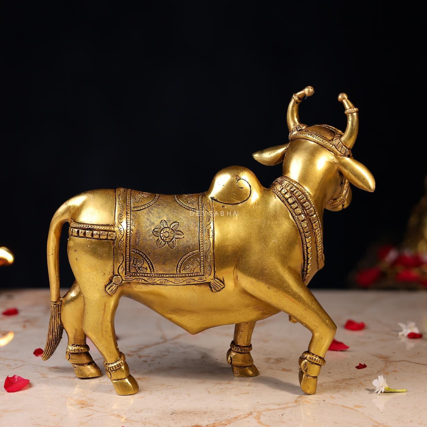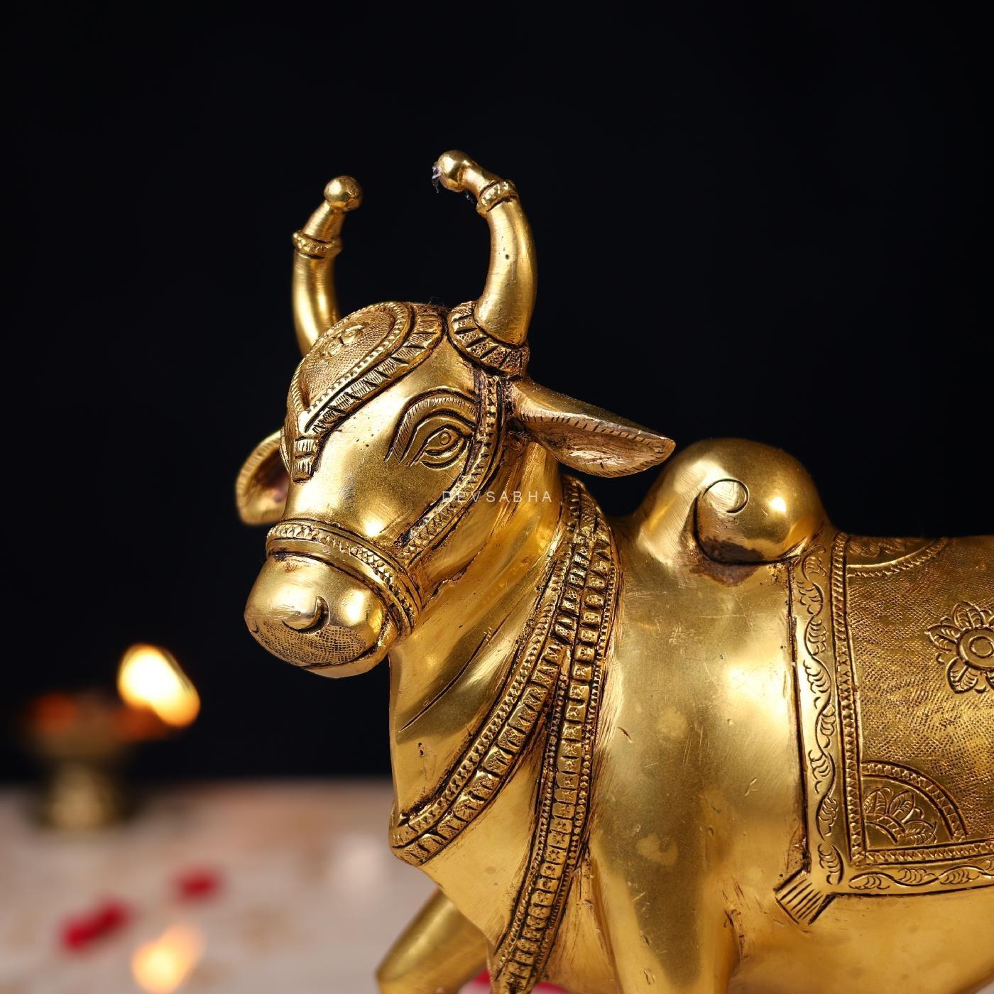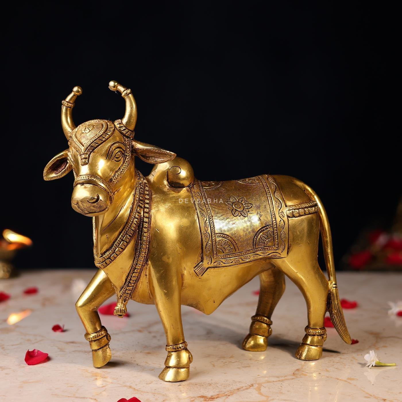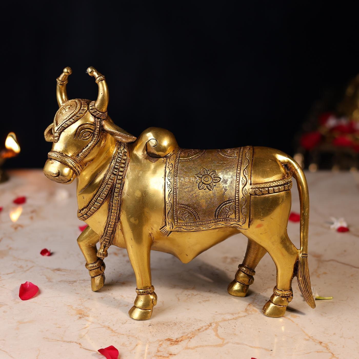 This Brass Nandi Idol (9 inches) is handcrafted from pure brass with fine detailing. Nandi, the sacred bull and vehicle of Lord Shiva, represents devotion, strength, and loyalty. Perfect for daily pooja, Shiva temples, or gifting, this idol adds spiritual grace and positivity to any sacred space.