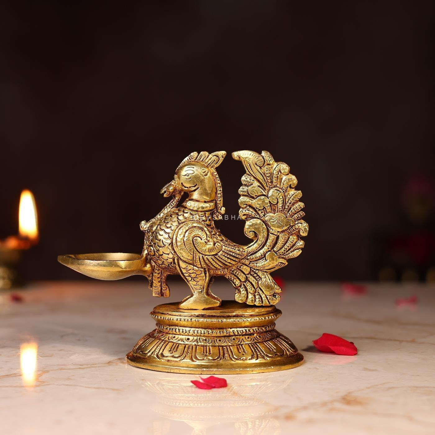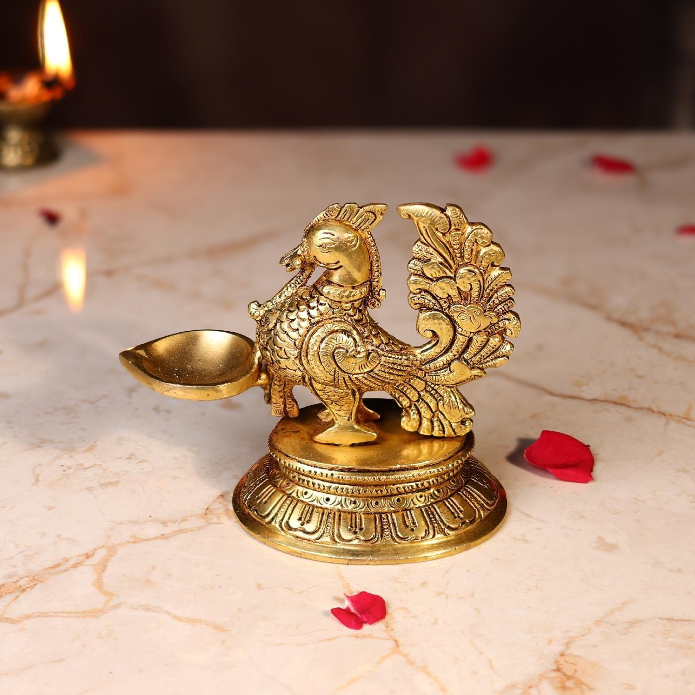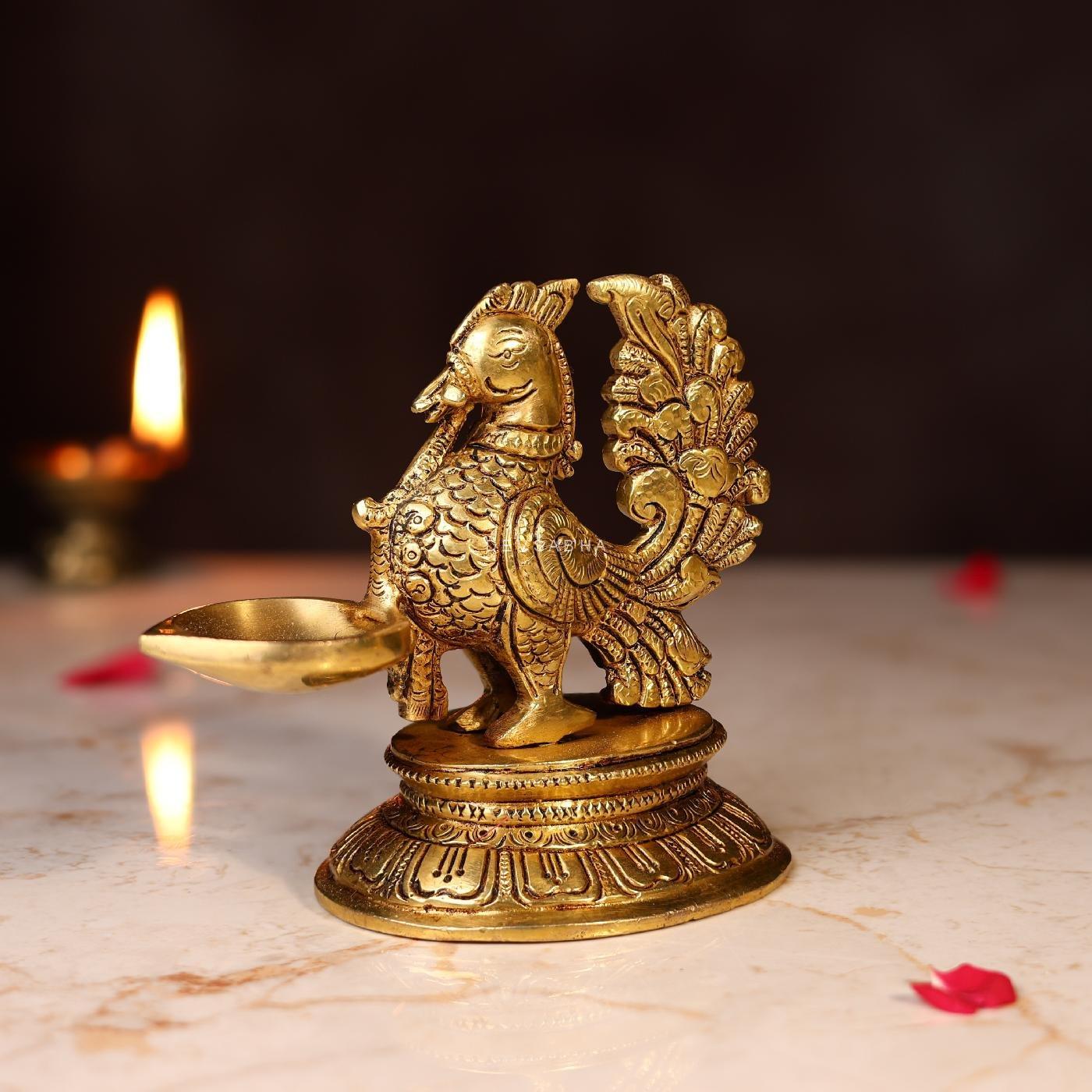 This Brass Peacock Lamp (4.5 inches) is handcrafted from pure brass with elegant detailing. Symbolizing beauty, prosperity, and light, it is perfect for daily pooja, festivals, or gifting. Compact and durable, it adds a graceful touch to any sacred space.