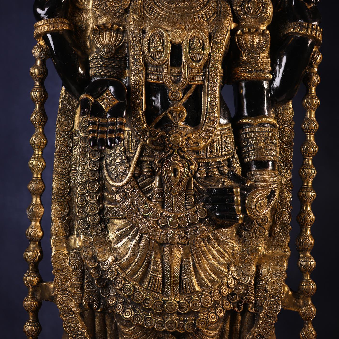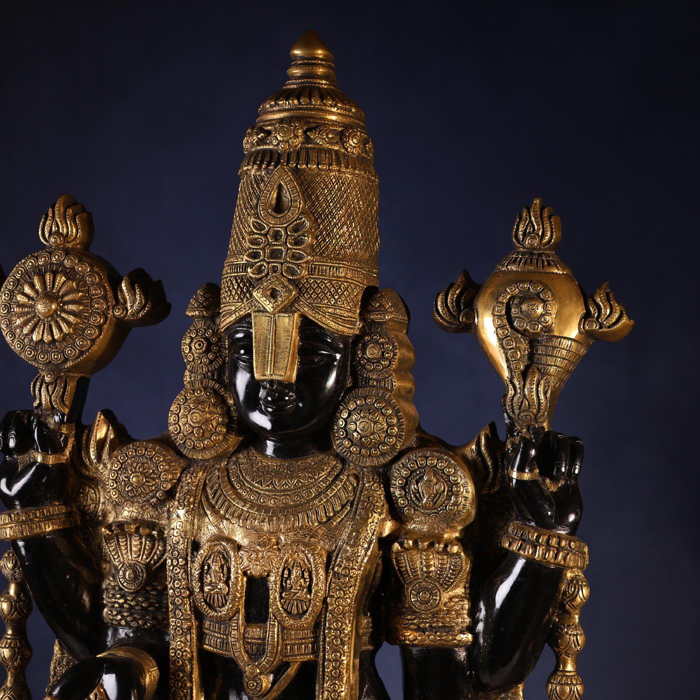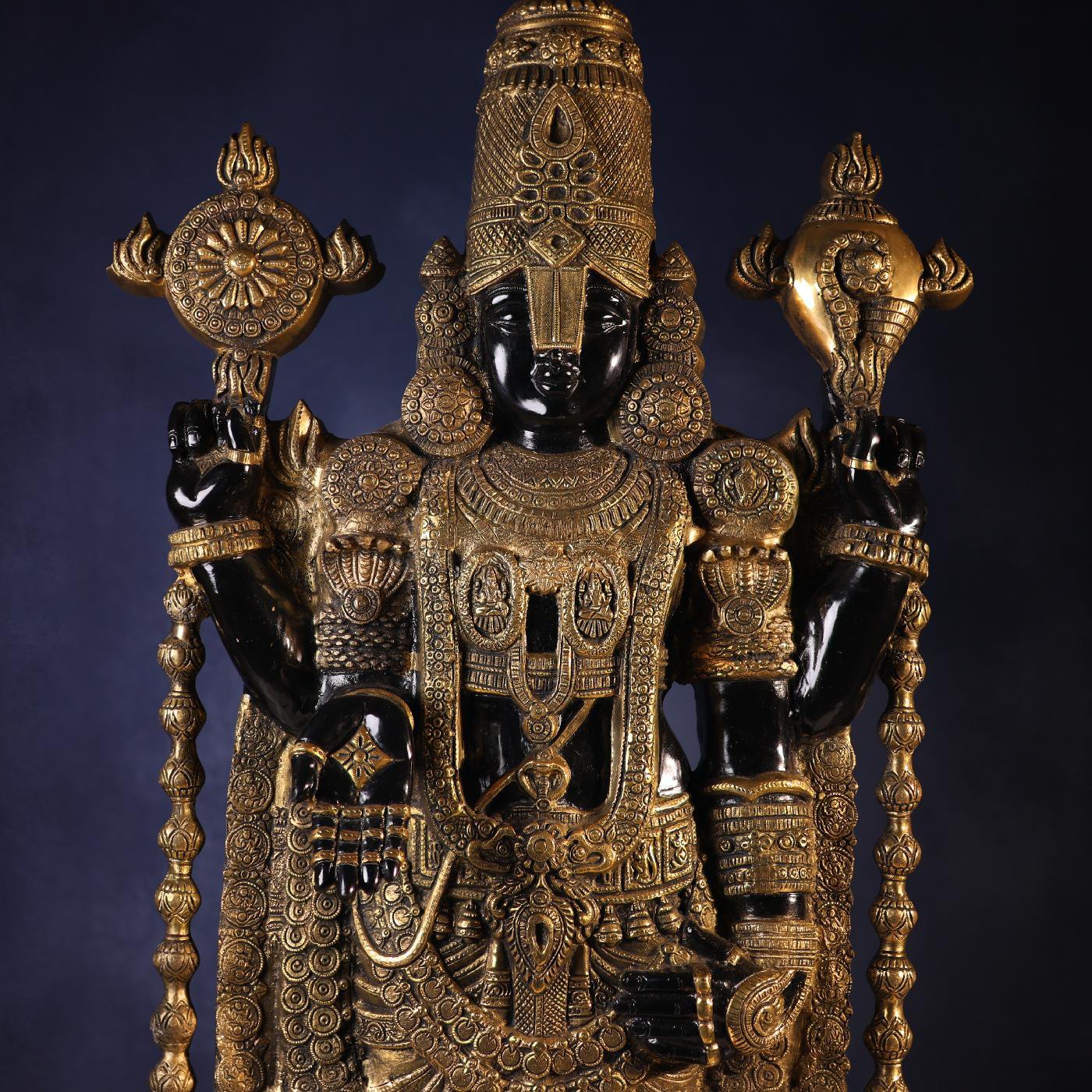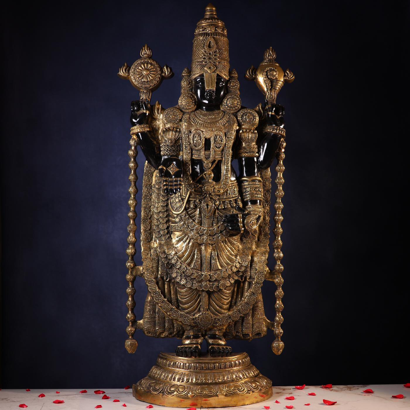 Experience the divine magnificence of Lord Venkateswara with this 48-inch Large Brass Black Colour Tirupati Balaji Idol. Expertly handcrafted with remarkable precision, this grand statue radiates spiritual energy, peace, and prosperity. Its striking black finish enhances the regal presence of Lord Balaji, making it a perfect centerpiece for temples, spiritual halls, or sacred home décor.