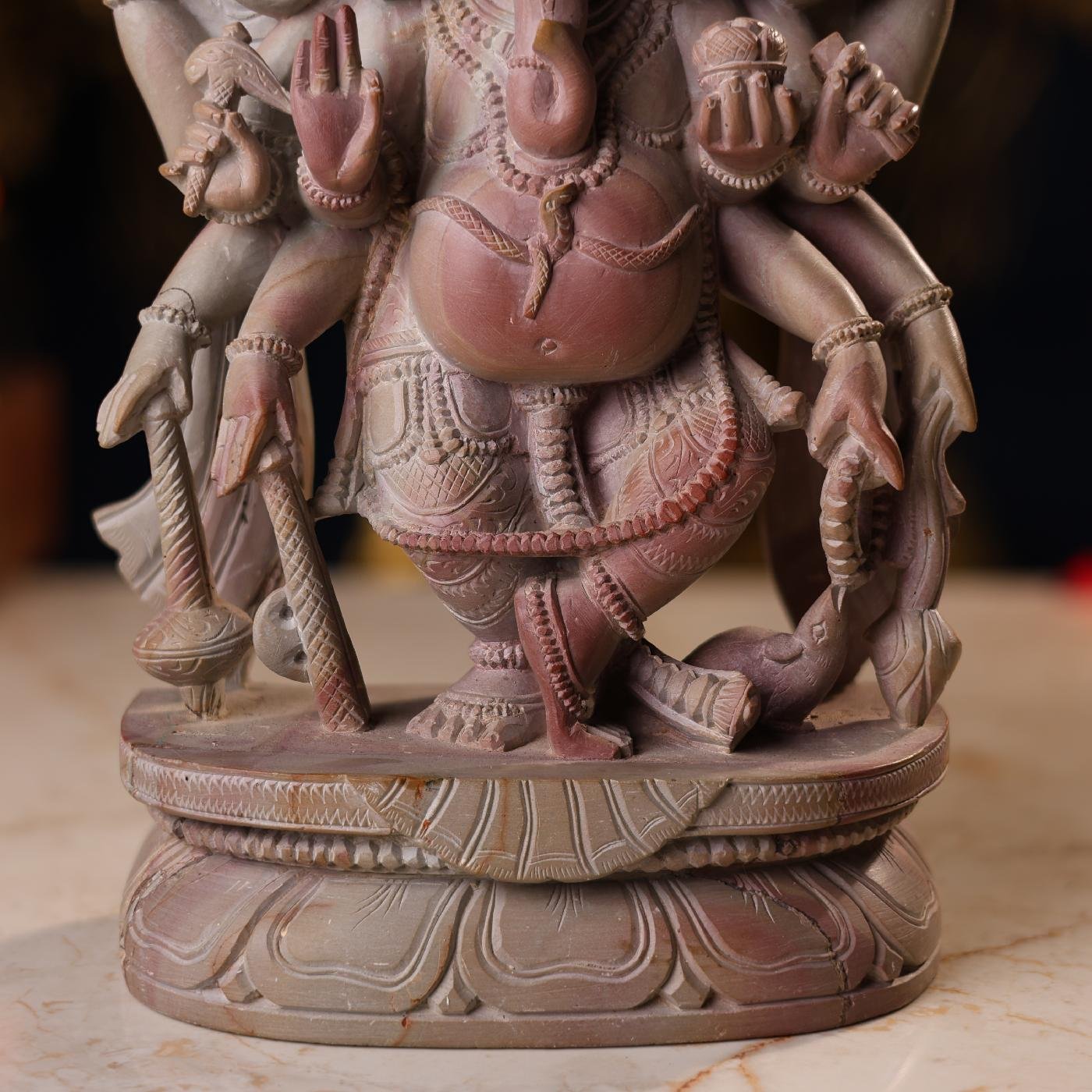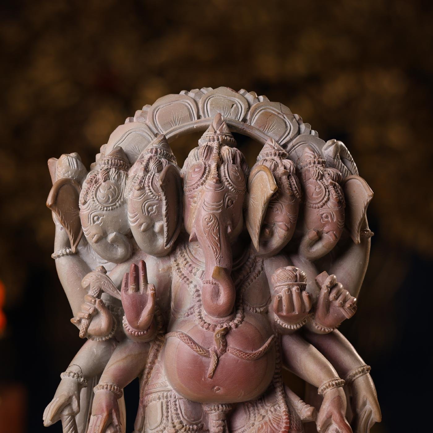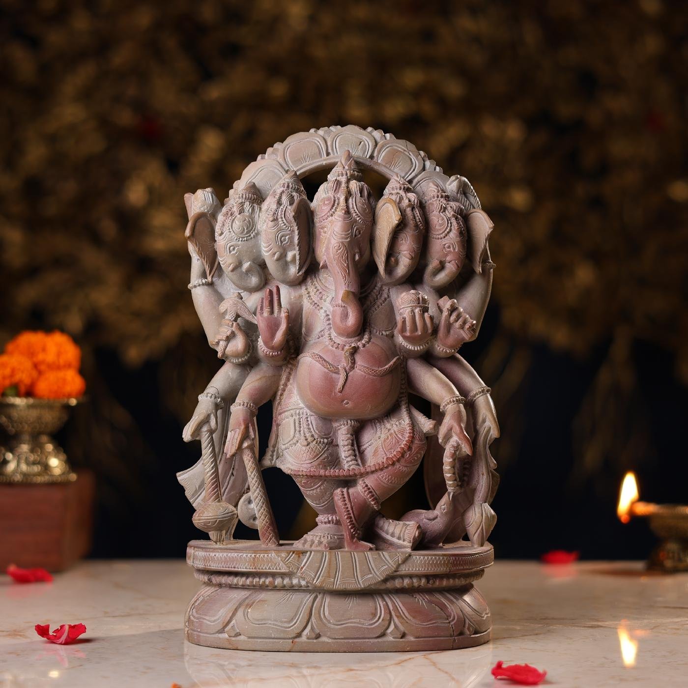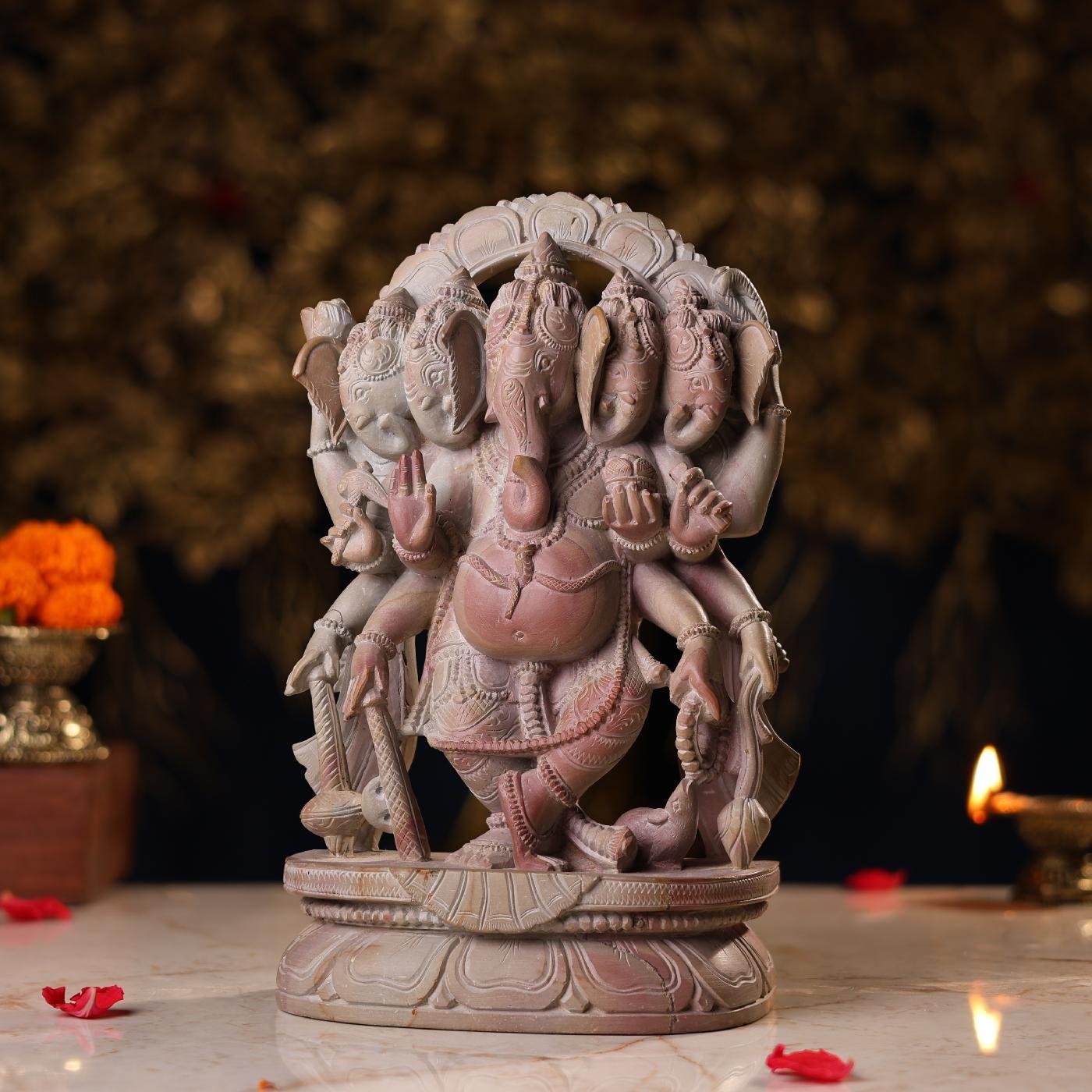 This Pink Stone Panchmukhi Ganesh Idol (10 inches) is intricately handcrafted with fine detailing. In his five-faced form, Lord Ganesha represents wisdom, prosperity, and divine protection. Perfect for daily pooja, temples, or gifting, this idol in elegant pink stone brings blessings, positivity, and spiritual strength to any sacred space.